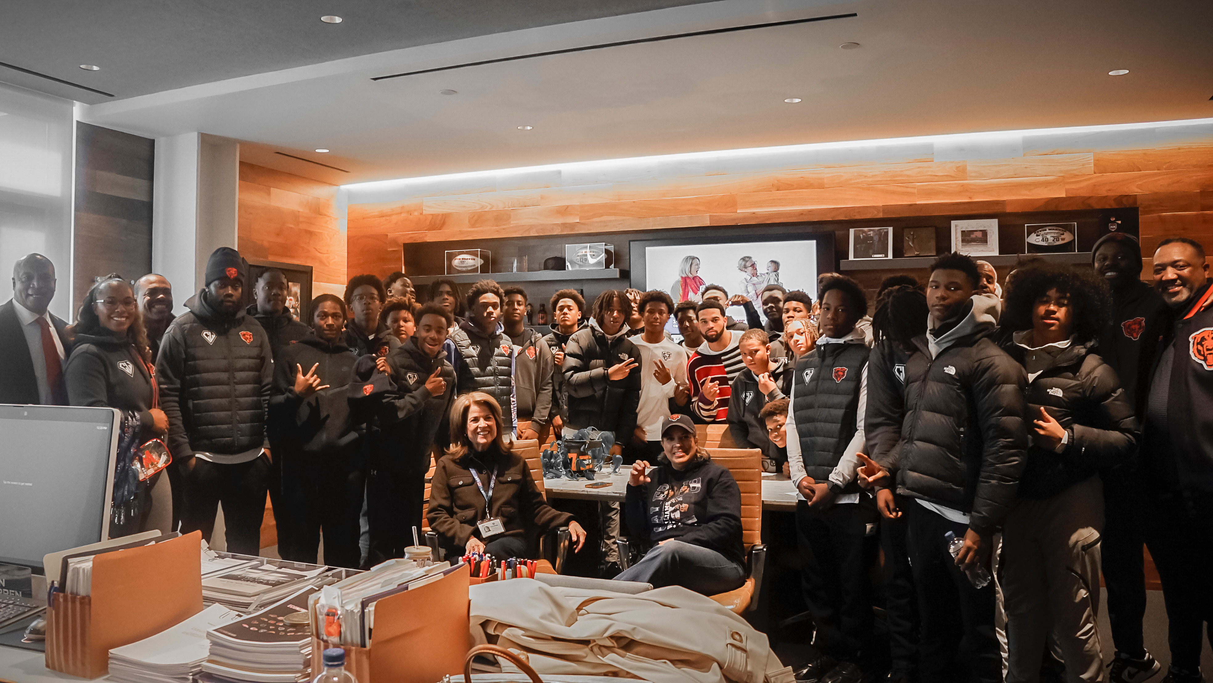 Following the game, the group met with several Bears executives, including Chairman George McCaskey, President and CEO Kevin Warren, General Manager Ryan Poles, Special Advisor to the President Ted Crews, Strategic Executive Partner Noor Davis and Team Archivist Claire Blakemore. Each shared their personal journeys, advice and encouragement with the young athletes.