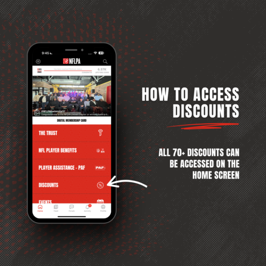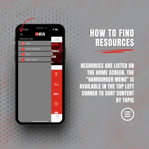 Once you log in, you will be able to access info you can also see on NFLPA.com, such as Player News, Benefits, Events, Discounts, Chapters, PAF, and The Trust. You can also select the "Hamburger Menu" (three lined icon on the top left), to sort your content by topics including "Health" and "Career Transition."