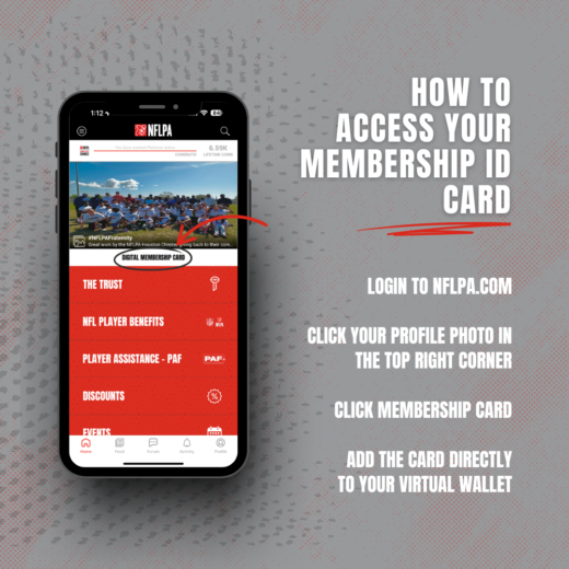 Login to NFLPA.com, click your profile photo in the top right corner, click on Membership Card, add the card directly to your virtual wallet!