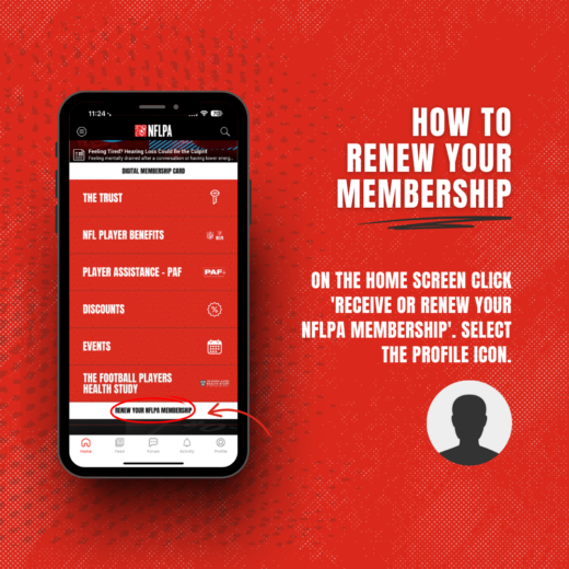 On the Home Screen click 'Receive or Renew Your NFLPA Membership' and select the profile icon.