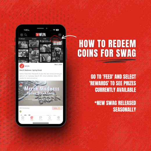 Almost everything you do on the app, from logging in to posting topics to reading articles to commenting on posts, earns you coins to redeem for NFLPA merchandise. Go to Feed and then select Rewards to see the great prizes currently available including backpacks, shirts, car decals and more!