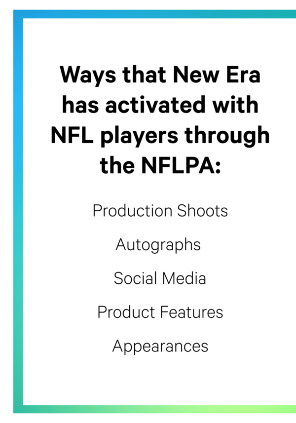 Through their agreement with the NFLPA, New Era is able to leverage the power of group player rights at NFLPA Rookie Premiere and other key moments throughout the league year.