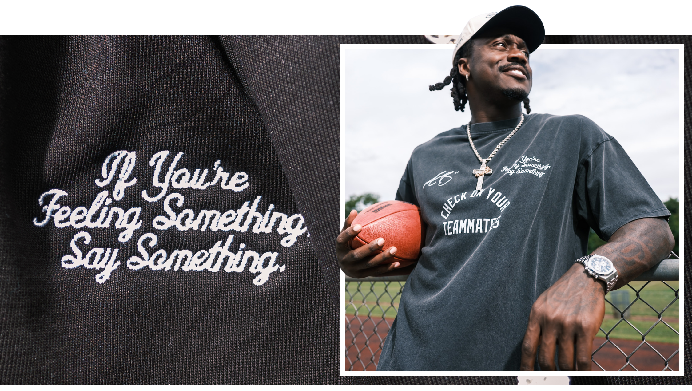 The breakthrough came when the work stopped feeling like a campaign and started reflecting A.J.’s own honest, grounded voice. He shaped the design and message, and his idea, “If you’re feeling something, say something,” became the heart of the collection. With Peace Collective and the NFLPA behind it, the initiative became a simple truth made visible: checking in is not a weakness - it's a lifeline.